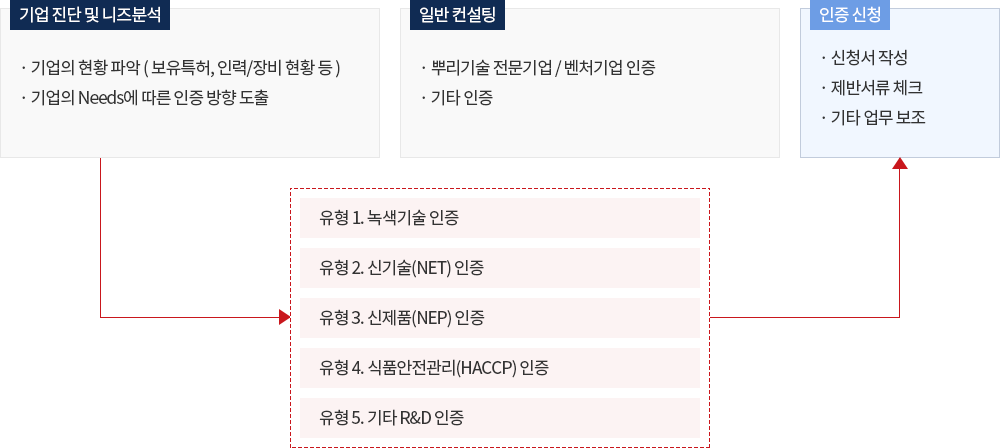 기업이 원하는 인증 유형에 맞춰 신청서 작성, 제반서류 체크 및 기타 인증에 필요한 절차 지원